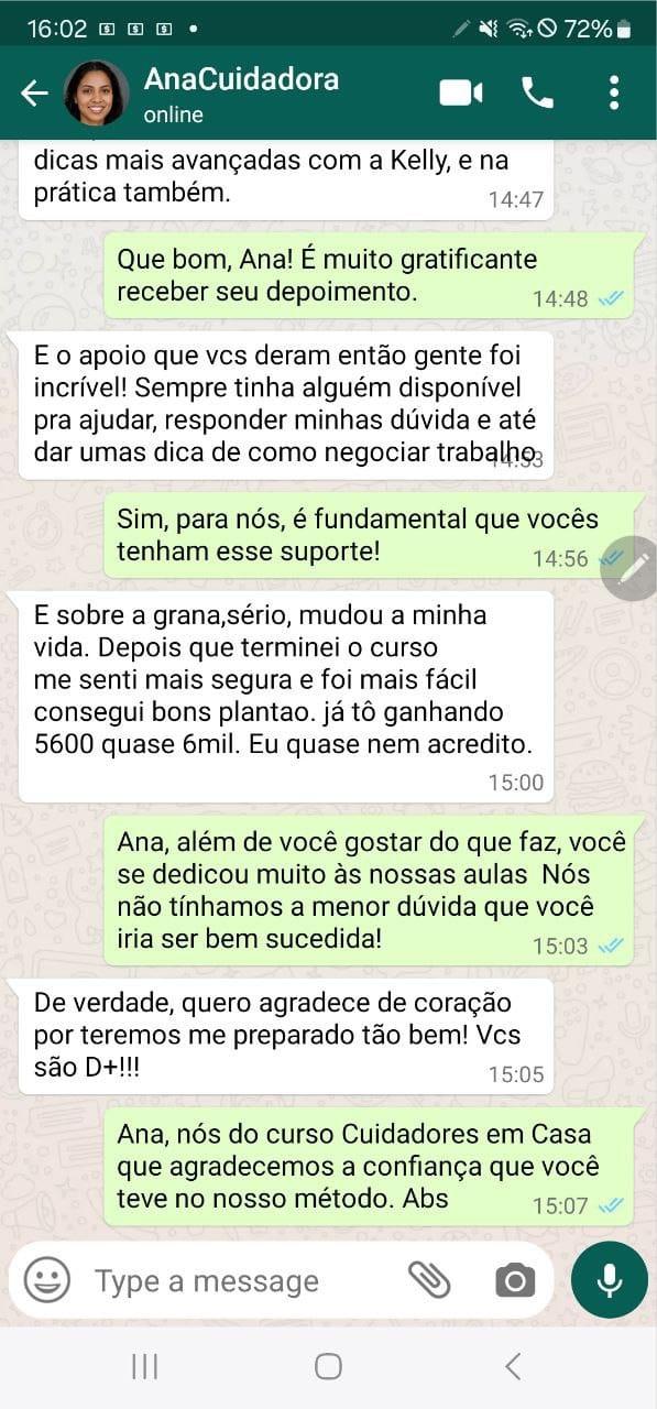 "Eu sou técnica de enfermagem e responsável pela gestão e coordenação técnica operacional da equipe de cuidadoras da empresa da Eliete (apresentação acima). Também tive a experiência de cuidar do meu pai que teve complicações por conta de Diabetes. A minha bagagem profissional e pessoal, juntamente com a constante dificuldade de encontrar cuidadores bem formados para trabalhar para nós fizeram com que a Eliete e eu desenvolvêssemos esse método de formação de cuidadores de idosos diferente de tudo que existe no mercado, o método 5K+. Essa metodologia aperfeiçoa a equipe de cuidadoras e, estando melhor preparadas, elas têm tido mais condições de aumentar a renda que elas fazem mensalmente.